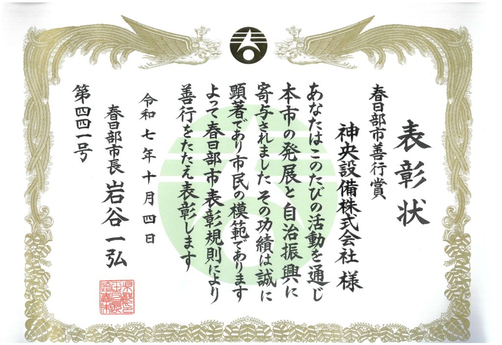10月4日 春日部市にて開催された春日部市市制施行20周年記念式典内表彰式において「善行賞」を受賞いたしました。